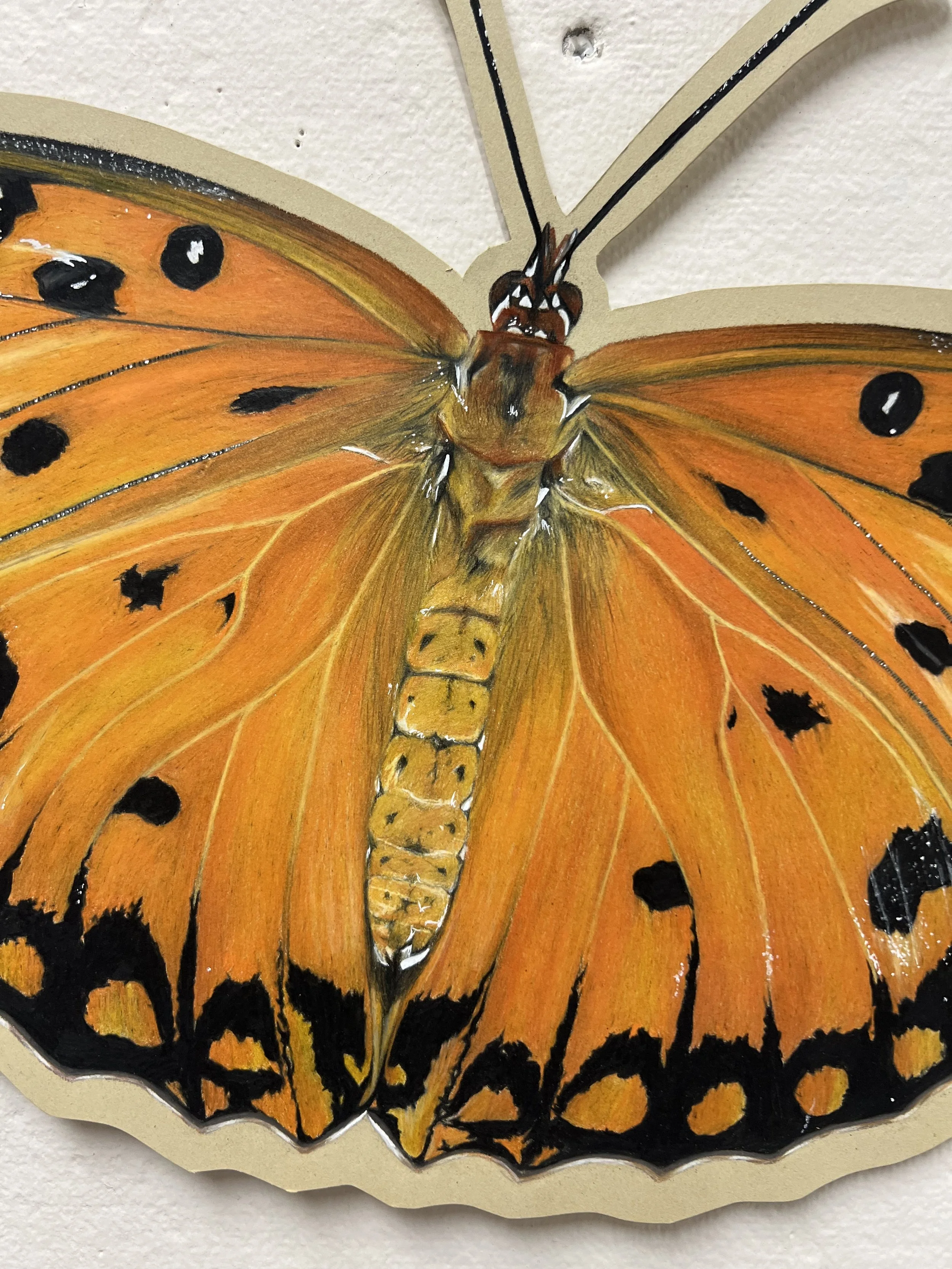 This drawing is larger than life, as it measures around 19” from the wingspan of the drawn insect. Many layers of Prismacolor colored pencils create a wonderfully smooth look for the wings of this gorgeous orange butterfly.