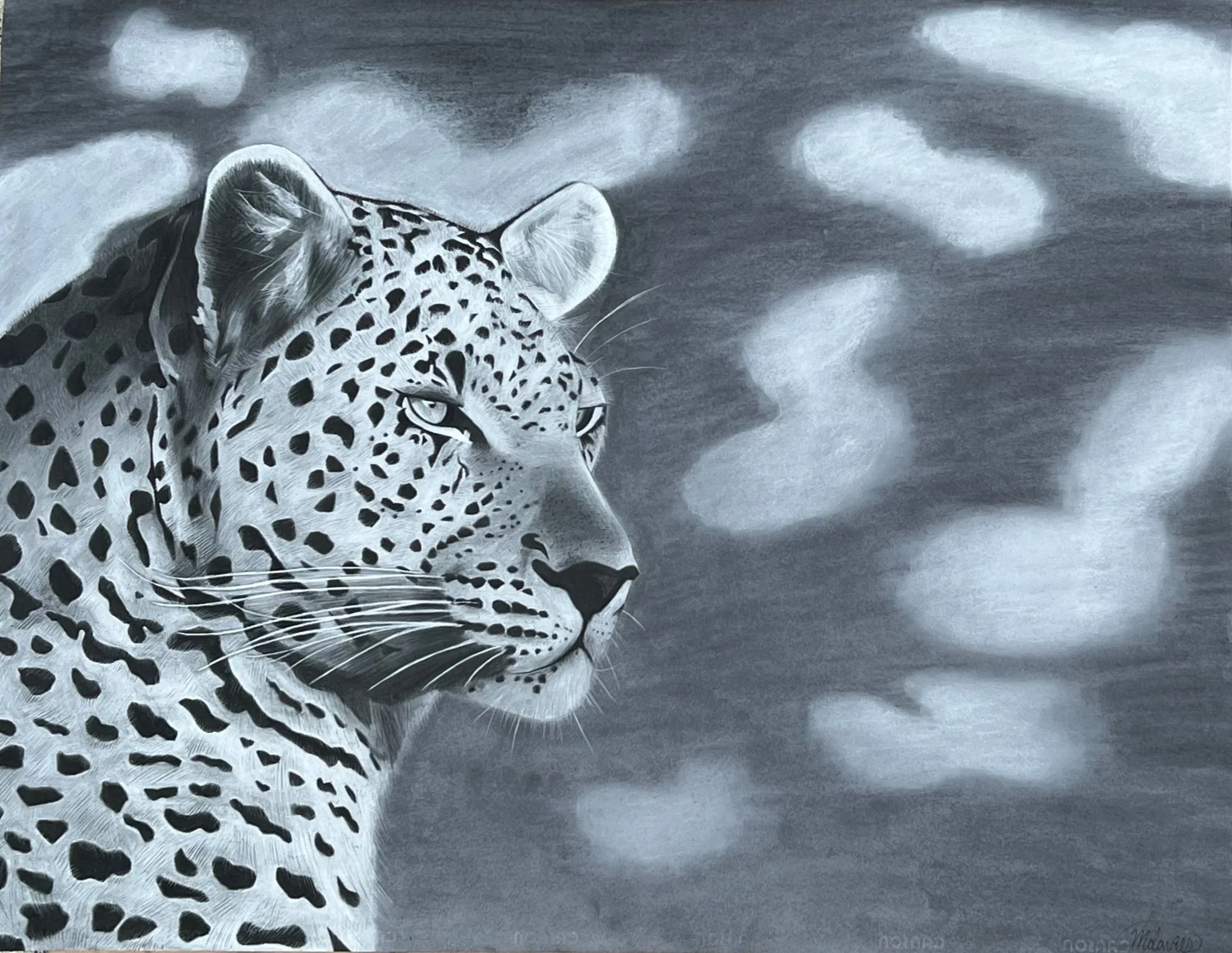 This drawing was created using white and black charcoal along with white gel pen on toned blue paper. This piece was made as a large animal portrait study, and it came along with a very experimental textured background. The drawing itself is large, and measures 19.5 by 25 inches. This study was a precursor to the large Sphynx drawing.