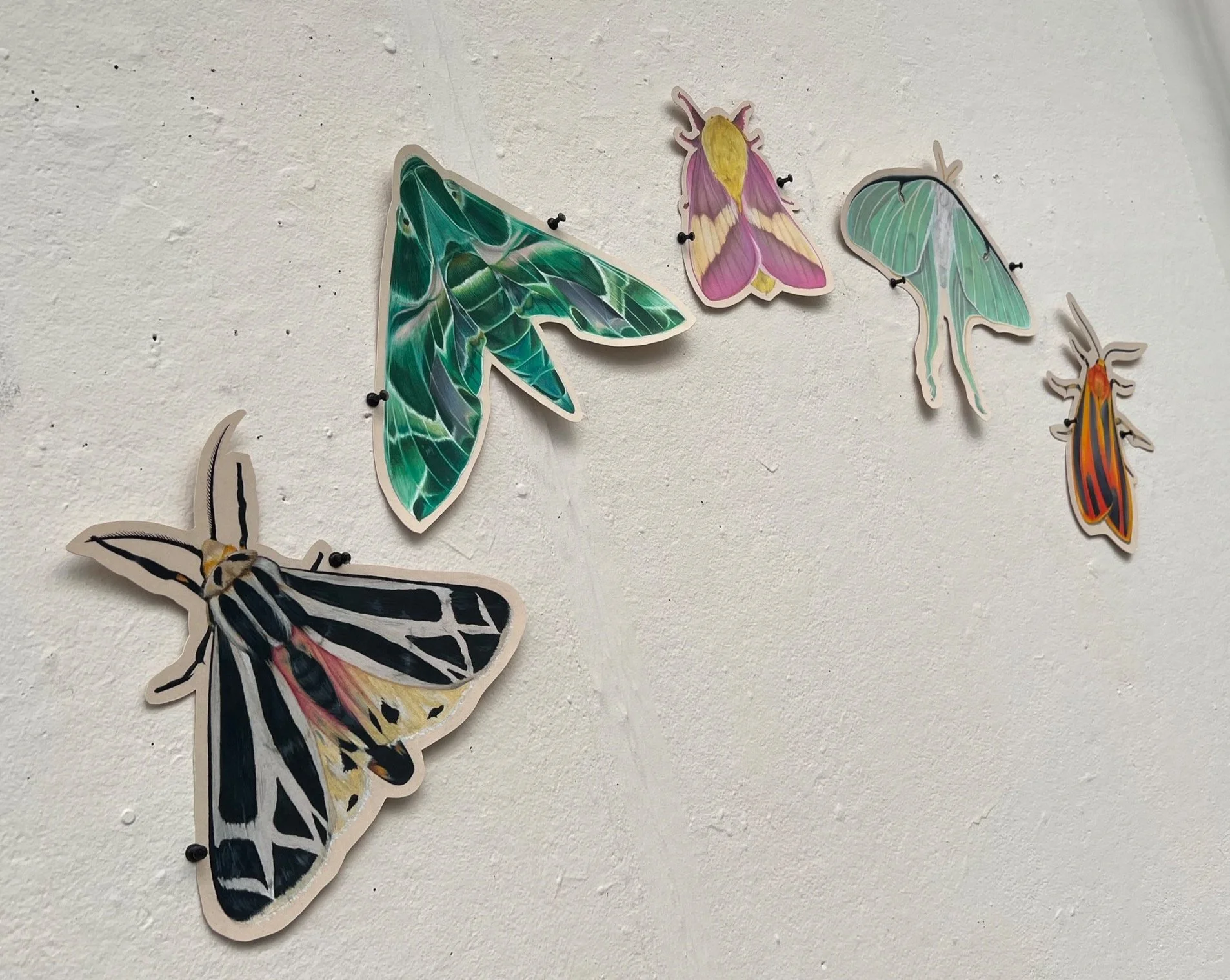 This drawing was created using many layers of Prismacolor colored pencils. The brilliant green color was a lovely challenge to tackle, and this moth came with lots of natural textures. The wingspan of the drawn insect is around 17 inches.