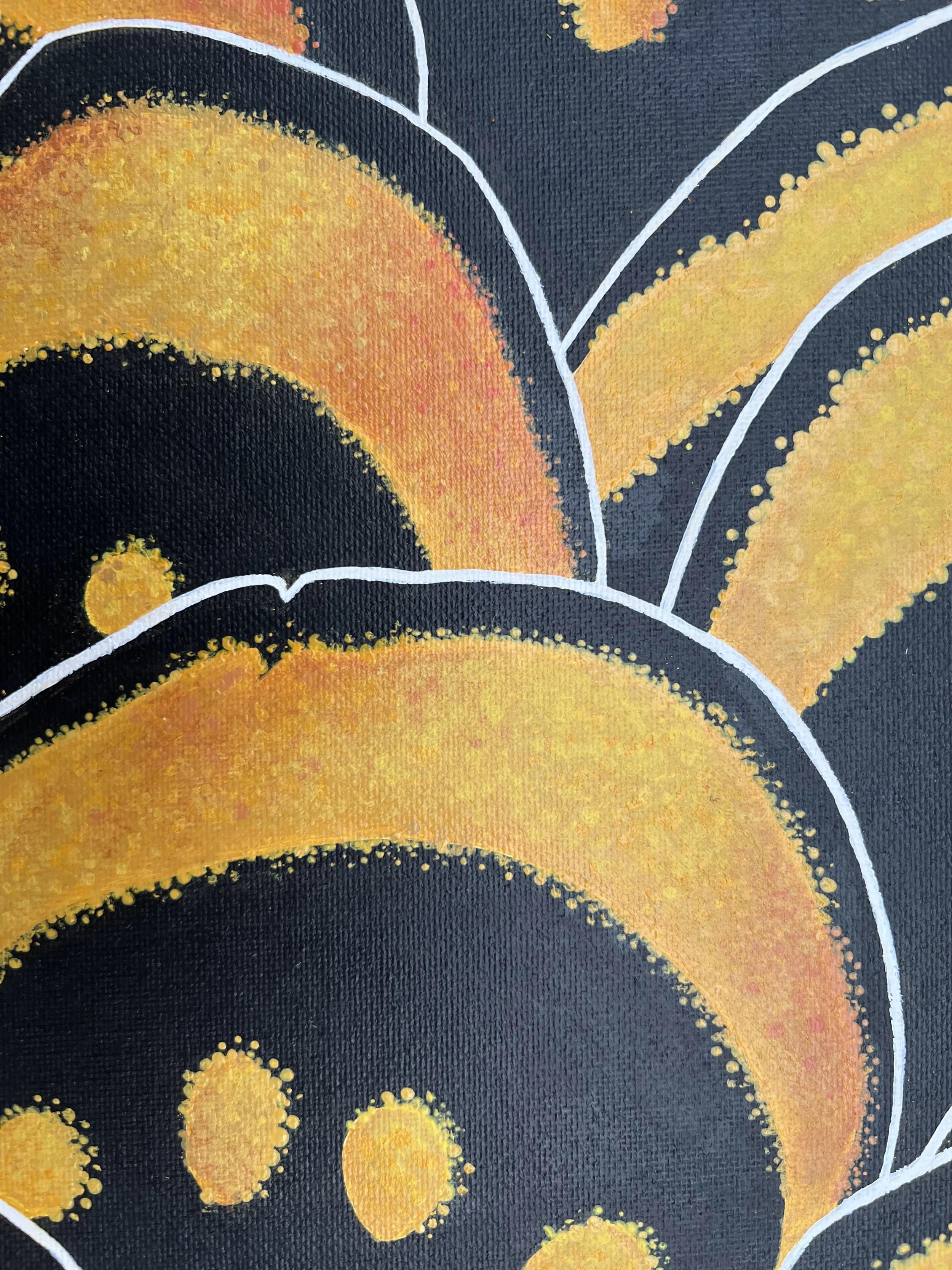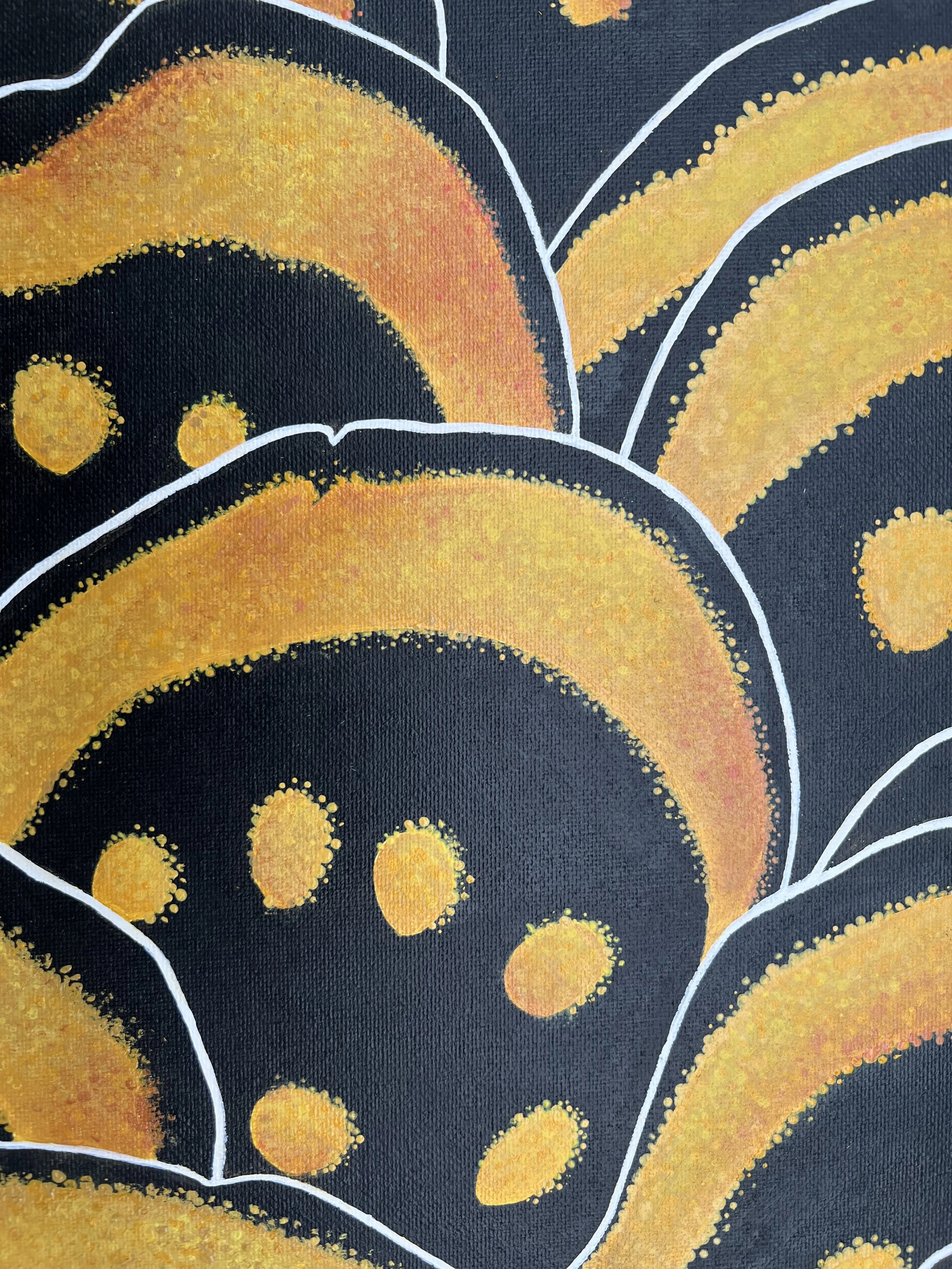 This painting is a macro image study of the texture of a nudibranch. The painting was made using acrylic paint, and lots of patience. It measures 14 by 11 inches large.