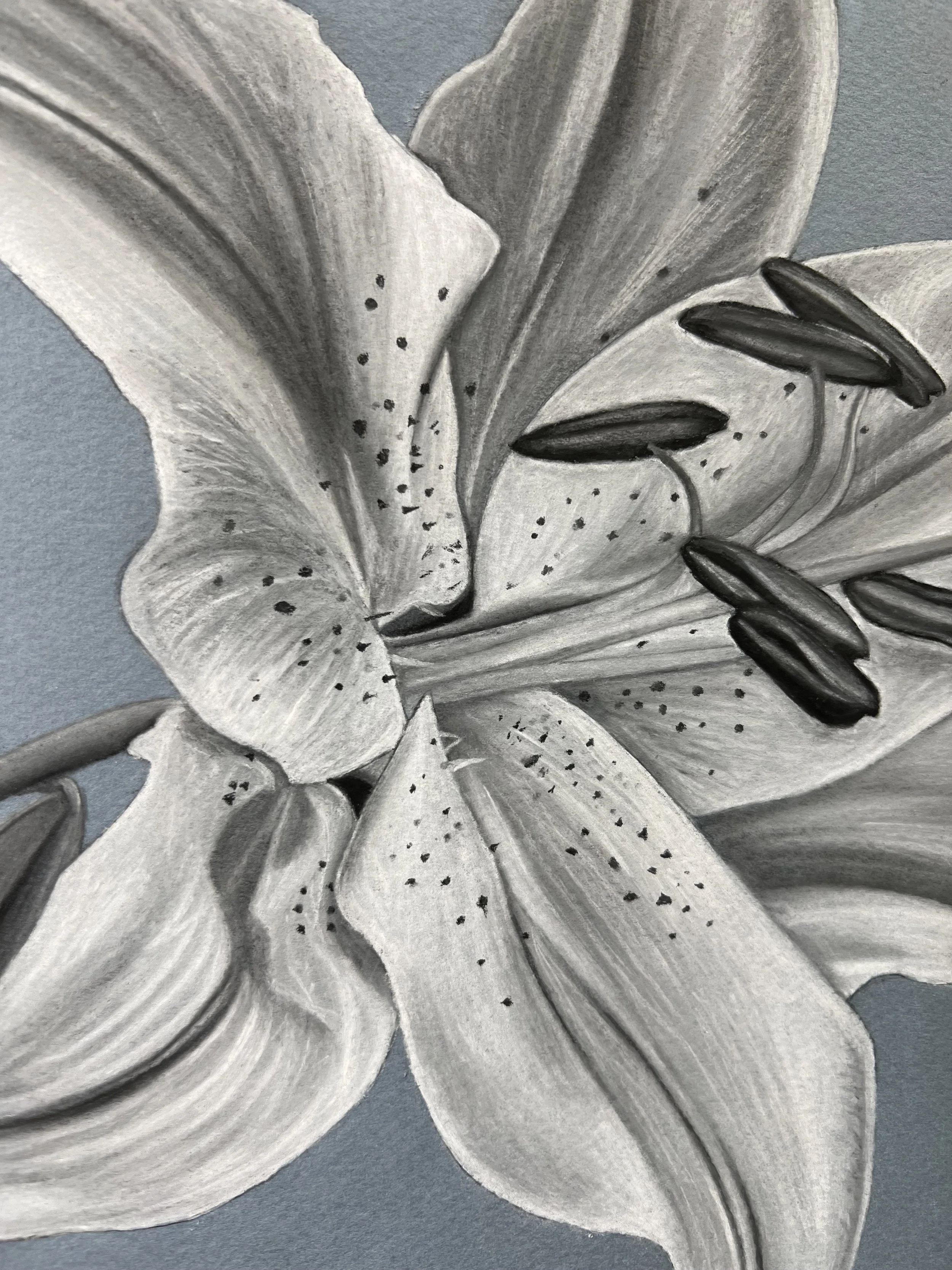 This drawing was created using white and black charcoal, on top of a toned blue paper. The paper was then cropped on the four corners to create a “framed” effect. It was a bit of a challenge to recreate all of the different textures within this large flower, but thanks to small sized blending stumps and sharpened charcoal pencils I had a fun time. The drawing measures about 10 by 16.5 inches.