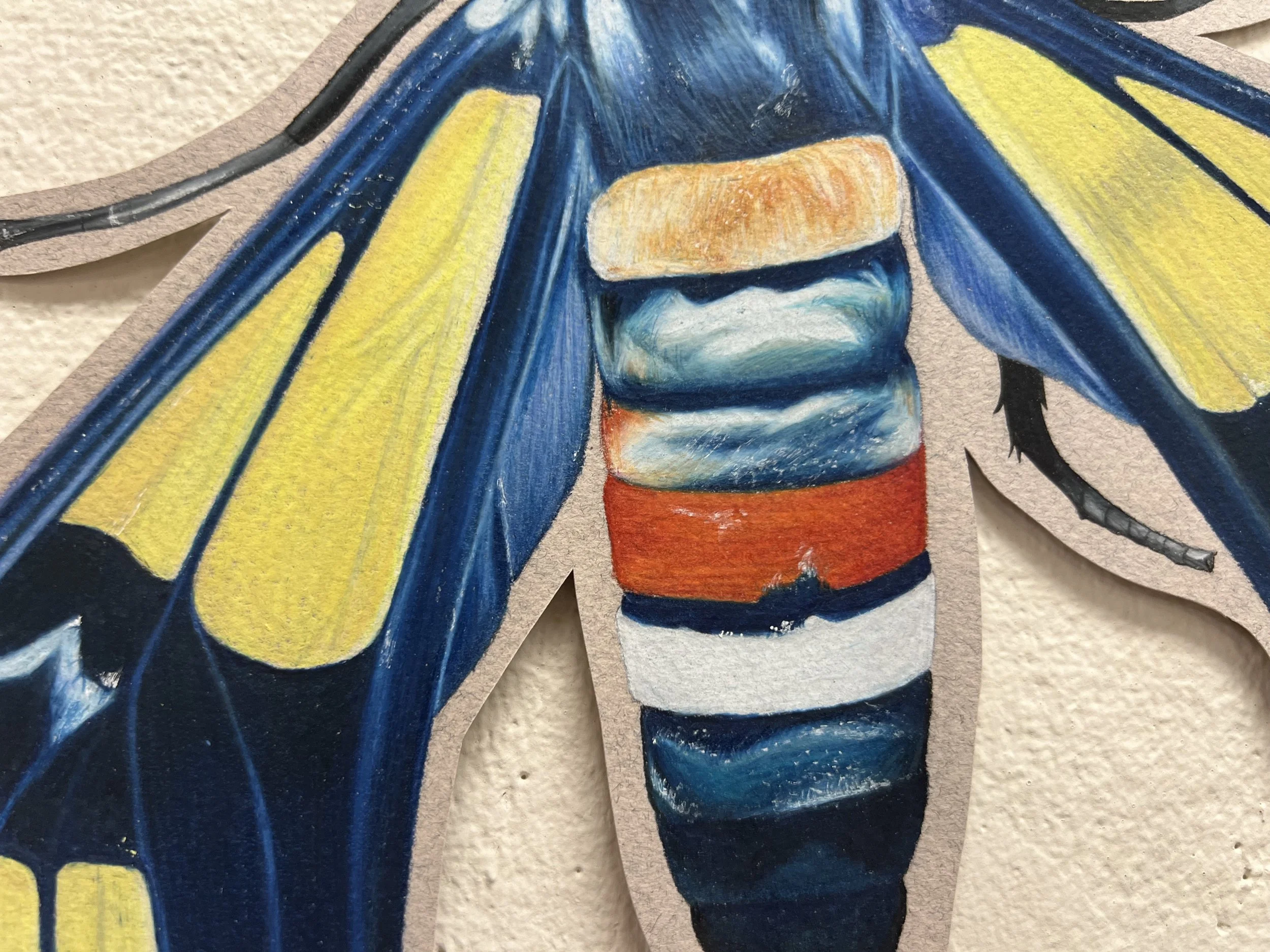 This drawing was created using Prismacolor colored pencils, black ink, and gel pen on top of a toned gray paper. The wingspan of the drawn insect is around 14 inches long.